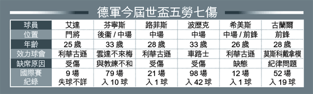 令路維更頭痛的是,除波歷克外,德國早已因各樣問題,而無法選召最佳球員(見附表);一般估計,若路維不作補選的話,最有機會代替波歷克於場上位置的,可能是前U21隊長、效力史特加的基迪拉,又或者是把史浩克04中堅韋斯達文推前踢中場。