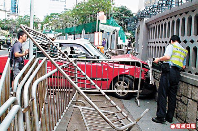 昨晨8時45分,的士沿上亞厘畢道西行,至禮賓府外一個右彎突然失控,掃毀擺放路邊的鐵馬圍欄,然後鏟上行人路,再撼向禮賓府的石屎圍牆。的士車頭摺曲損毀,配件甩脫,用作分隔示威者的鐵欄橫七八豎倒在地上和車頭。