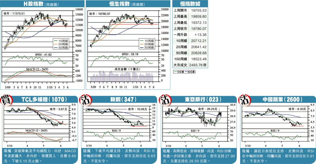 支持方面,即市看10日線(19534)、19423,之後是19000心理關口及日前低位18971區,再之後是18712,較理想的發展在18971前企穩。反彈阻力方面,周線圖的重要阻力區仍是20500區,其中包括10周線(20712)、20周線(20641),及50周線(20828),為後市主要阻力區,暫時無力上破,即市看20000心理關口。