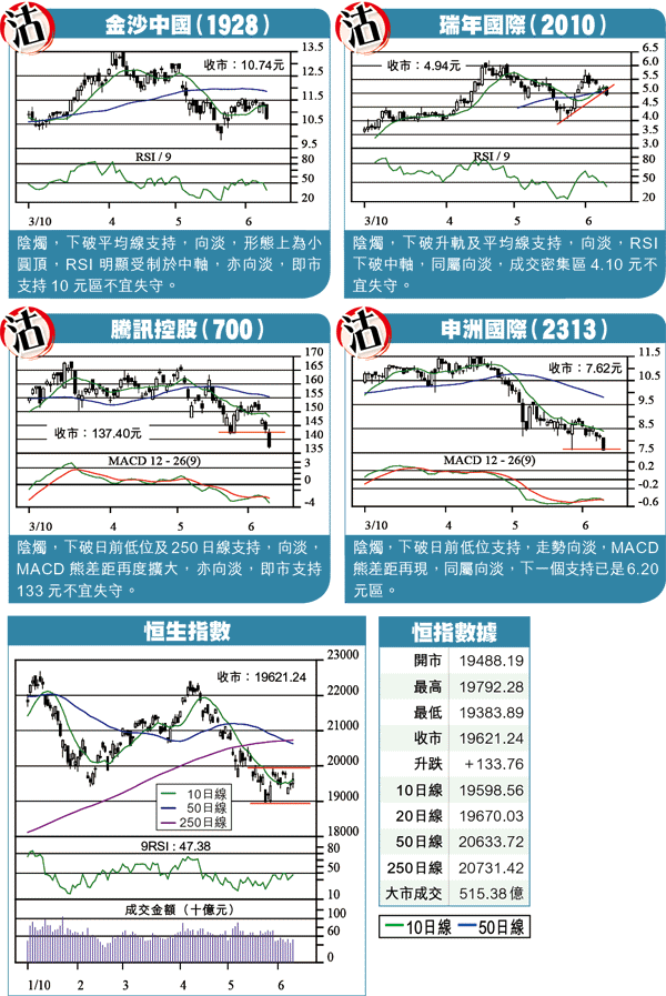 支持方面不變,仍看19000心理關口,這個日前低位、長方形底部18971重叠區,以現時走勢計,大市似乎逐步脫離危險期。反彈阻力方面,重回10日線後,最近的阻力已是19910,至於20日線,最多不過是個中途站而已。