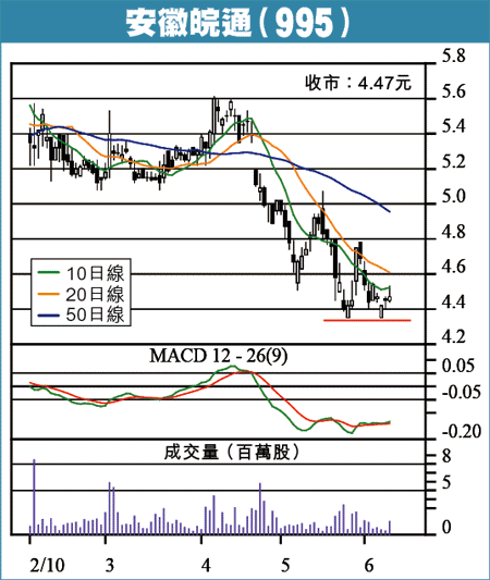 安徽皖通(995)4月初高位5.61元,其後跟大市回落到4.40元水平,跌幅逾2成,現價4.47元,往績PE9.7倍,息率逾5厘,已頗具吸引力,可吸納作中線持有。