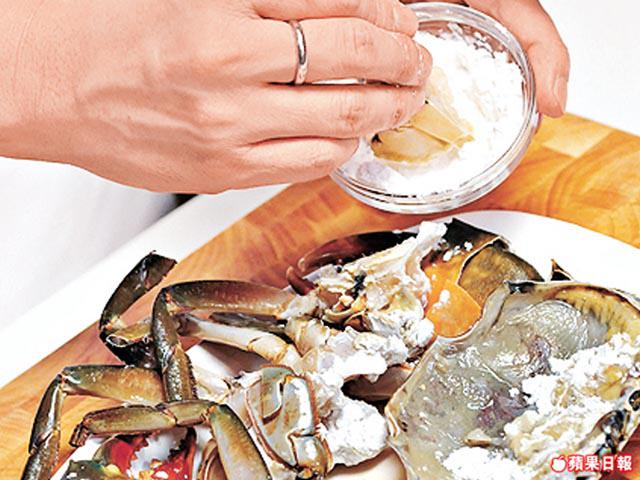 2.將青蟹斬件及清洗乾淨後,再撲上生粉。