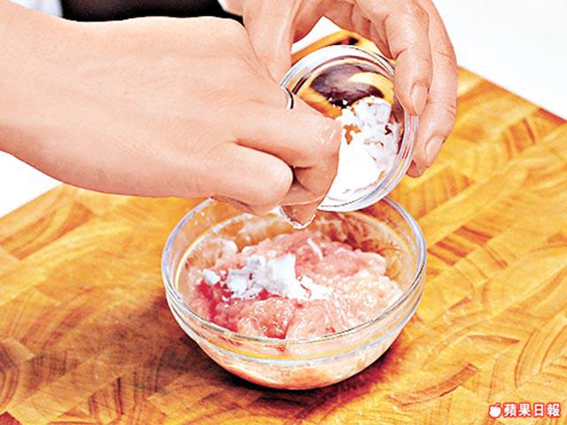1.豬肉絲加蛋白拌勻,下鹽及生粉拌勻醃5分鐘。