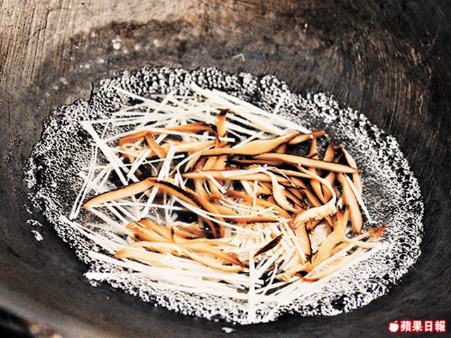 3.燒滾水、下冬笋絲及冬菇絲汆水後盛起。