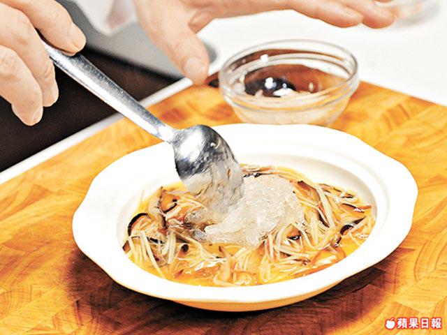 4.另再開大火燒熱鑊,下高湯、鹽、冬笋絲、冬菇絲、生粉水兜勻,再下老抽、金華火腿絲推勻,淋上蛋面,最後放上燕窩即完成。