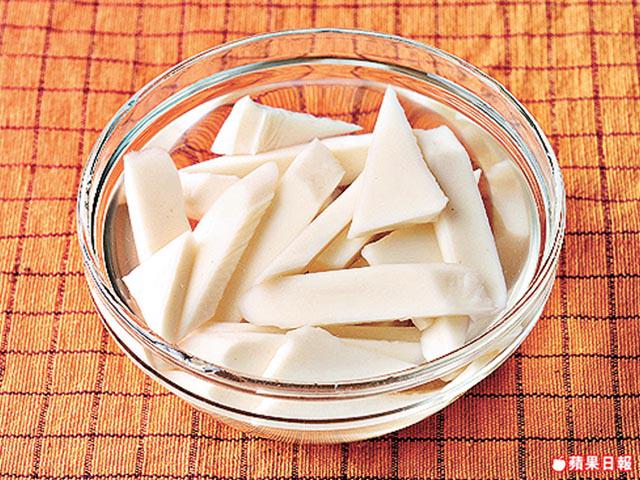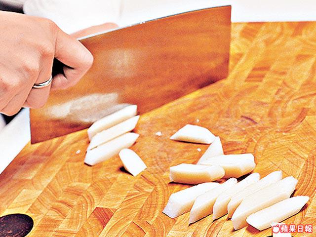 1.將年糕切片,放入凍水中浸一晚,然後放入滾水中汆水後盛起。