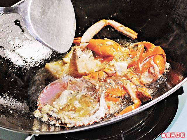 3.開大火燒熱約半鑊油至60℃,放入青蟹件用大火煎炸2至3分鐘,待蟹轉金黃色即盛起。
