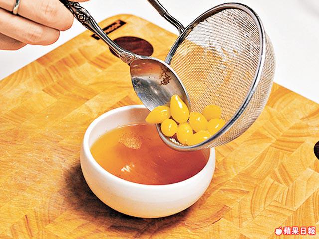 1.將半份蜂蜜加入75毫升水,再下銀杏,以大火燉30分鐘後取出。