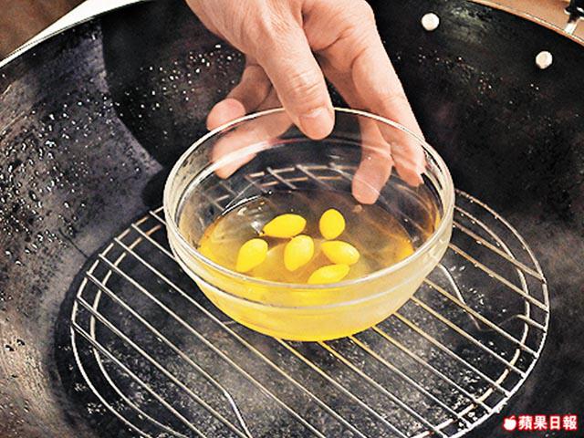 蒸水蛋,我由細食到大,但用鵪鶉蛋蒸出的水蛋的確未試過。姚師傅教路:「雖然鵪鶉蛋細細隻,但味道比雞蛋濃,可以蒸得好嫩滑,入口即化,同平時蒸水蛋的口感不同。」忍唔住偷食試一啖,滑溜程度足以直跣入喉,各位小心鯁親呀!