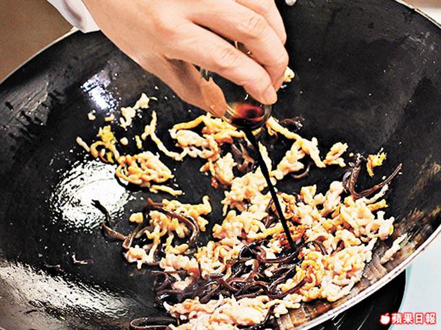 4.將鑊中炸油倒走,開中火,原鑊下薑米起鑊,加入海鮮醬爆香,放入豬肉絲、黑木耳絲、金針菜炒勻,下老抽、糖及高湯再炒至略收乾,以生粉水埋芡後上碟。