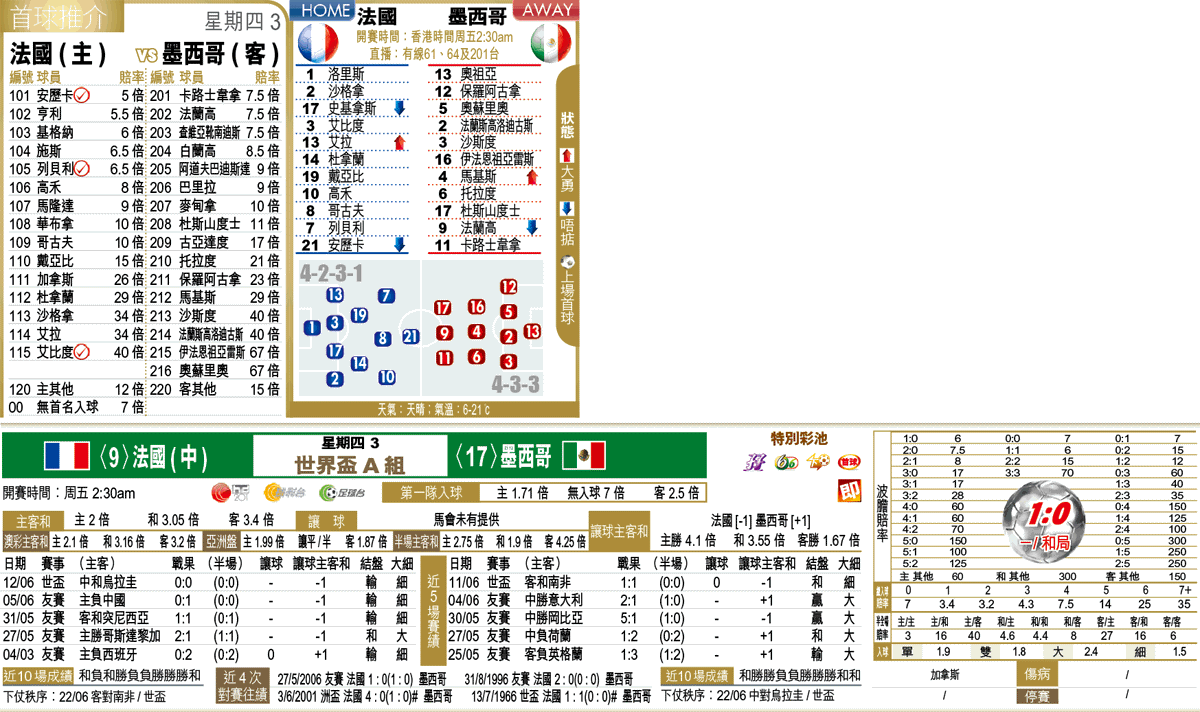法國與墨西哥交手往績亦甚佳,近6次對墨西哥取得5勝1和,對上一次交手是06年的友賽,法國小勝1:0,此6倍波膽可追。