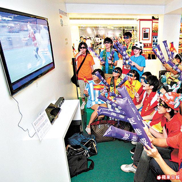 在商場看3D直播,同樣要戴3D眼鏡,只限播7:30pm及10:00pm頭兩場賽事,即日用電子貨幣單次消費滿$100便可入場,若你覺得戲院票價太貴,又想感受3D直播的現場感,這是不錯選擇。