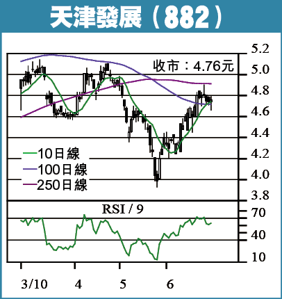 天津發展(882)昨收4.76元,升0.4%。股價於上月底自4元邊回升,呈一浪高一浪走勢,前天10日線升越100日線現黃金交叉,再添強勢訊號,昨天大跌市以陽燭陀螺力守10日及100日線,成交增加,股價日內料會上試位處4.91元的250日線,破關後有機會反覆推向5.80元。