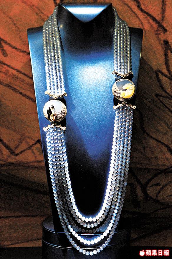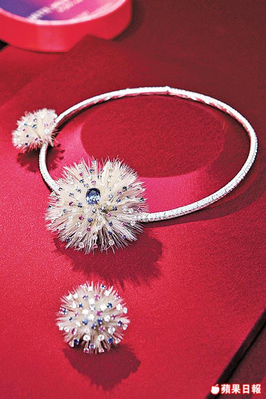 大象造型的胸針,靈感源自《氣球上的五星期》一書內小插曲,象頭設計呼應着從森林跑出來,協助拖走破熱氣球的神話巨象,繫於象鼻上的氣球是一枚重48.13卡的黃晶;另外創作靈感源自《環繞月球》的Andromede頸鏈,以鑽石及欖尖形紅寶石鑲嵌,透過光線折射及靈活姿態來凸顯不凡的魅力。