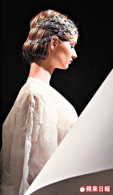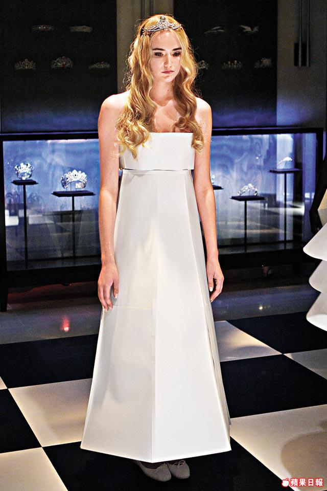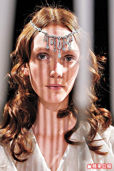 另一房間,多位模特兒整齊穿上白色娃娃紙裙示範后冠、headband,hairclip,各人化身音樂盒上的小仙女,旋轉舞動行catwalk。系列中的Josephine后冠、headband以黃金和鑽石組成,與秀髮成一體,當中一枚重10.31卡梨形黃鑽佇立在后冠中央,盡顯royalbeauty的氣質。