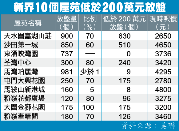 美聯數據指出,新界10大屋苑中,叫價200萬元以下盤源約2130個,當中以嘉湖佔最多,現有900個放盤,其中佔630個屬樓價200萬元以下的單位,相對年初已減少25%;粉嶺花都廣場及牽晴間低於200萬元放盤則較年初減少5%。