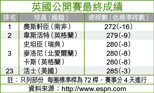 美國球手活士僅錄得285桿並列第23位,但他仍可保持世界第1位置,而奪冠的奧斯軒臣世界排名將由54位跳升至15位。