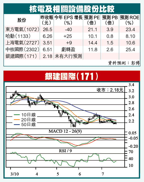 嫌銀建炒味濃,可留意核電設備股哈動,公司近年逐步轉型拓展水電和核電設備產品,尤其後者,去年取得62億元新定單,大增兩倍。相比同業東方電氣(1072)及上海電氣(2727),哈動今年預測PE只有10倍,PB更不足1倍,估值最低。股價昨成功企穩6元密集區阻力,建議6.20元水平入市,目標7.50元,失守5.70元止蝕。