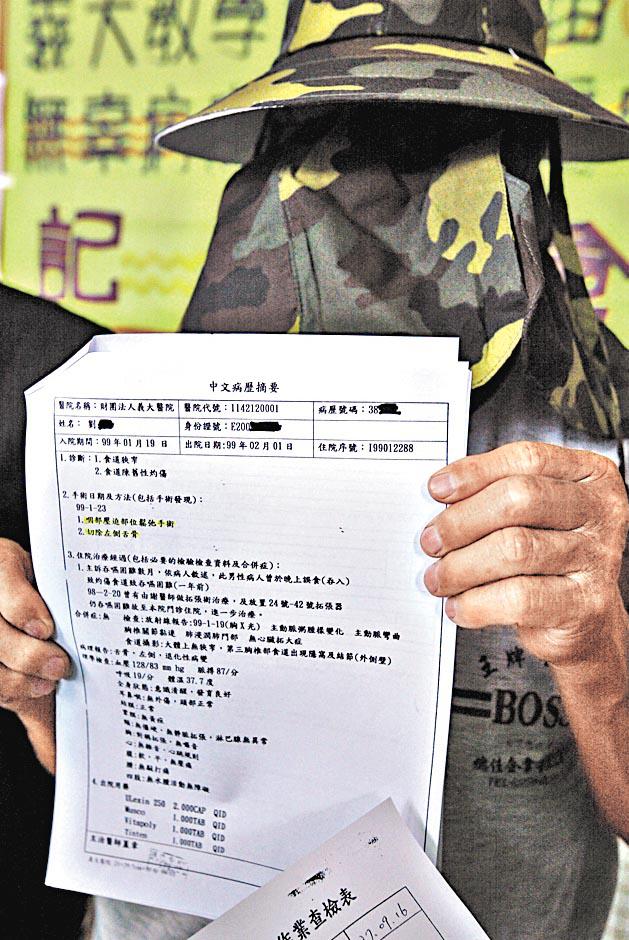 被開錯刀的62歲劉武雄昨日召開記者會聲討。劉妻表示,今年1月23日,其夫因吞咽困難到義大醫院做手術,主刀醫生為院長陳宏基。