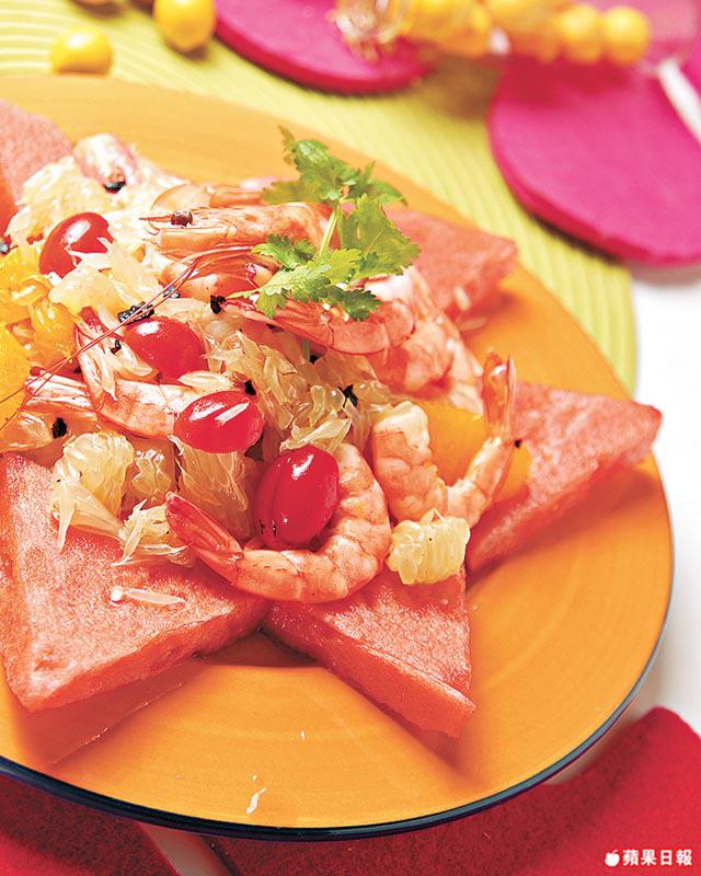 海中蝦300克(灼熟)、柚子肉200克、橙1個、車厘茄6粒、西瓜900克
