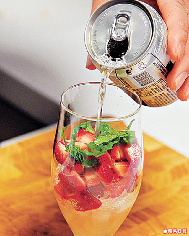 4. 杯中先放入冰粒,加入士多啤梨、薄荷葉和青檸汁,再加入梳打水和鹽即可。