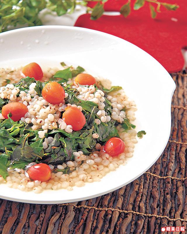 4. 煮滾熟薏米水,放入薑片及車厘茄,加鹽調味。最後把薏米水連車厘茄淋在灼軟枸杞葉上,即成。