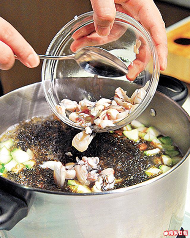 4. 田雞湯煲滾,放入薑片、絲瓜和西瓜皮粒滾15分鐘,加入紫菜,最後加入調味即可飲用。
