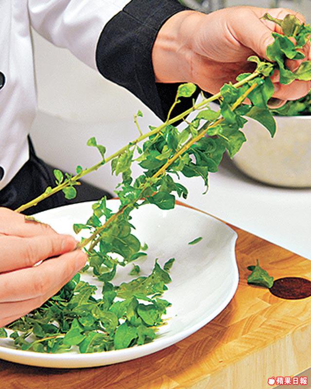 2. 枸杞摘下嫩菜葉,用滾水灼軟備用。