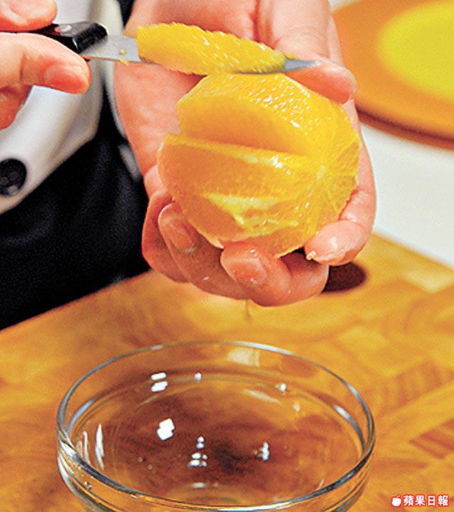 2.橙去皮用小刀起肉。柚子肉撕開。車厘茄對切。青檸榨汁。