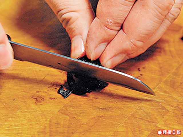 3. 烏梅浸水15分鐘後,去核,切茸。加入烏梅汁的其他材料再拌勻。