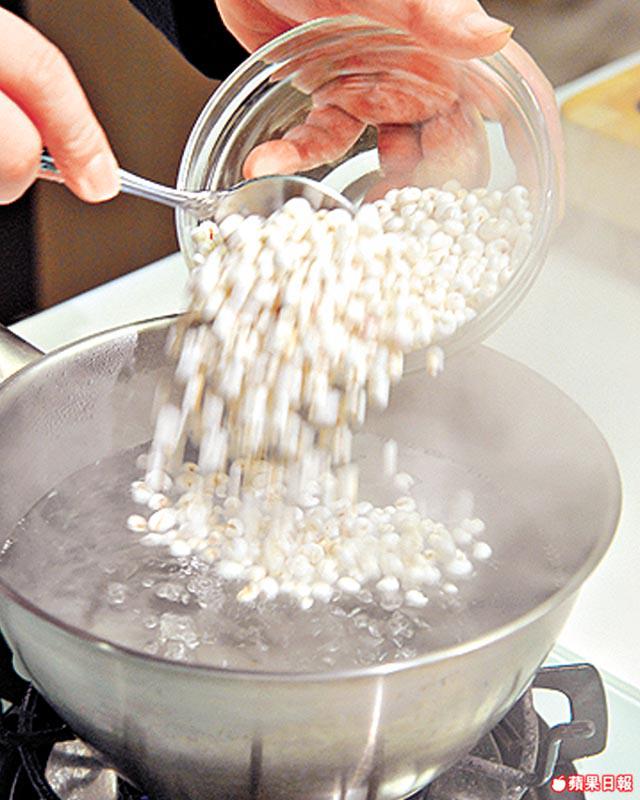 1. 熟薏米洗淨,加水煲45分鐘成薏米水。