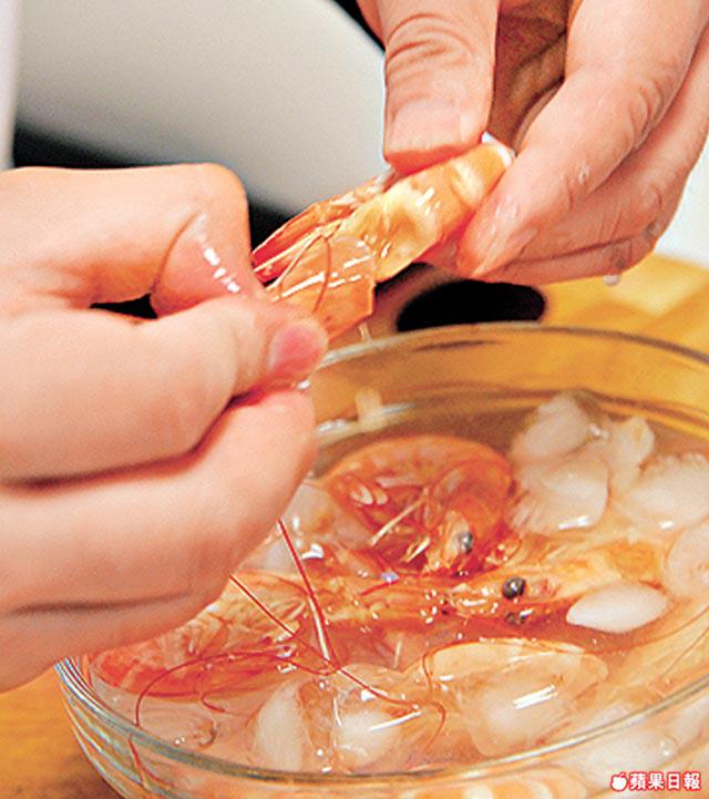 1. 灼熟的海中蝦浸冰水令肉質保持彈性,去殼留尾備用。