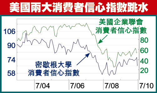 正當市場因零售市道持續好轉而亢奮,兩個指數最近卻雙雙「跳水」。6月底公佈的企業聯會消費者信心指數,從上月的62.7大跌至52.9,密歇根大學消費者信心指數亦從75.5跌至66.5。領先指標轉差,下半年美國零售市道應心中有數。