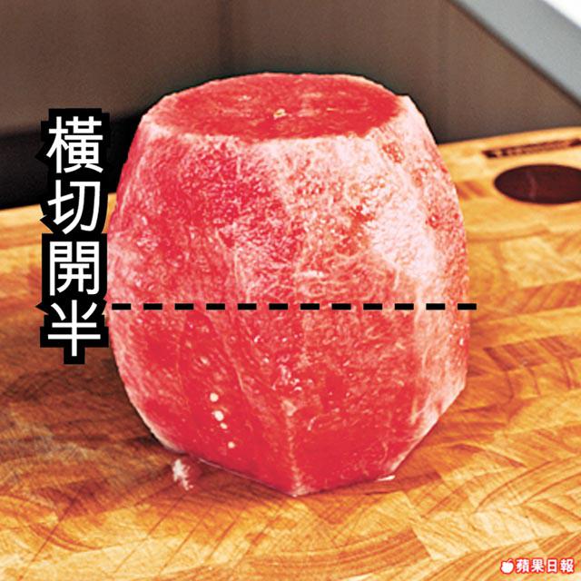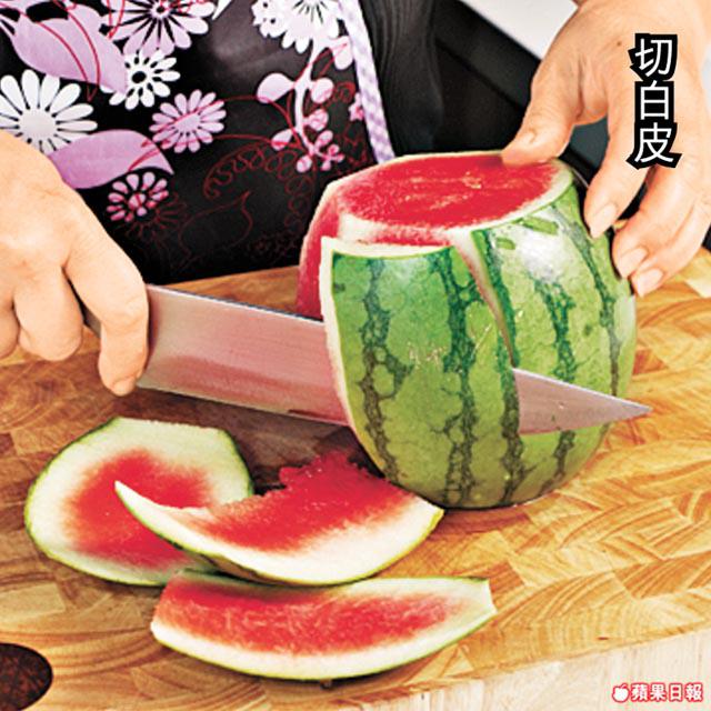 在YouTube看到《30秒削西瓜皮絕技》一片,除了快靚外,還可保留最多的西瓜肉及汁。不過無師傅的強勁臂彎可以單手捧起西瓜,教你一個異曲同工的削西瓜方法吧!將西瓜去頭去尾,然後把西瓜坐起,沿着白邊將皮削去。削走皮後將西瓜打橫對半切開,再將闊底那邊向下放好再切片,這樣做可以保留最多西瓜肉及汁,雖然這方法30秒做不到,但3至5分鐘亦無問題。