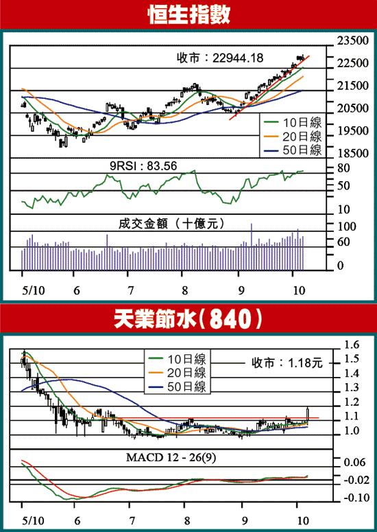 內地即將召開第17屆五中全會,農業例牌是政策扶持重點,加上預期西部開發是議題之一,從事灌溉系統及設備相關業務的天業節水(840),食正兩大概念,有得炒。該股上周已呈突破,上周五升0.09元或8.26%,收1.18元,成交532萬股。