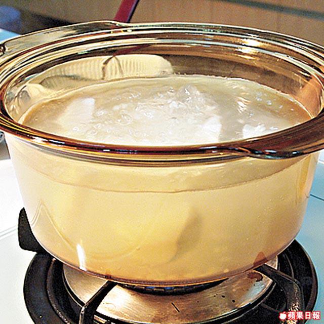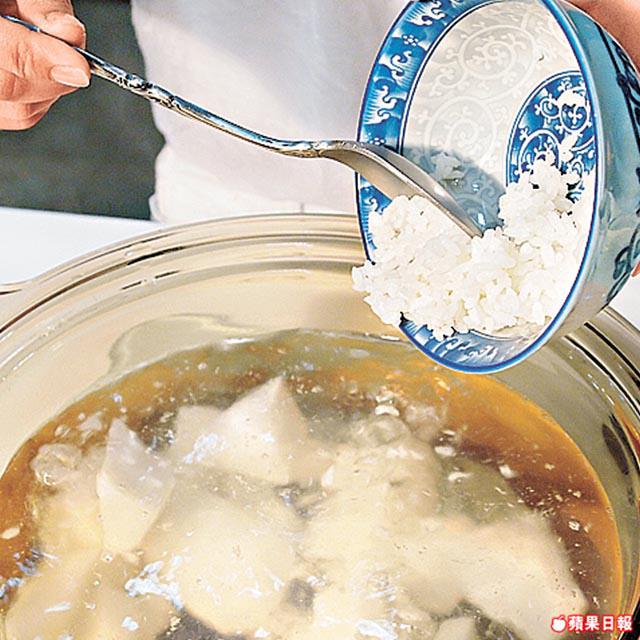 煮滾水,將半碗白飯和蘿蔔一同放入煲內。