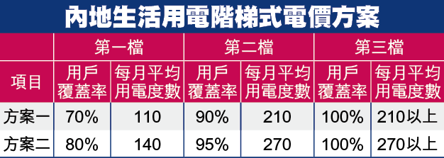 比較兩套方案,基礎電量分別為110度及140度,覆蓋全國70%及80%居民用量。現時浙江、四川及福建3省分已試行階梯電價,前兩者的用電價下降趨勢較為明顯,據悉北京明年中亦會發佈階梯電價政策。華北電力大學教授張粒子認為,與工業用電相比,居民用電佔整體用電量的比重較小,故居民用電漲價不會對居民消費價格指數(CPI)構成重大影響。