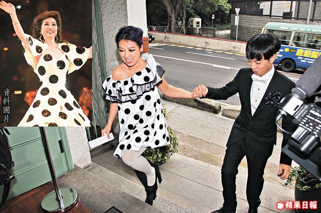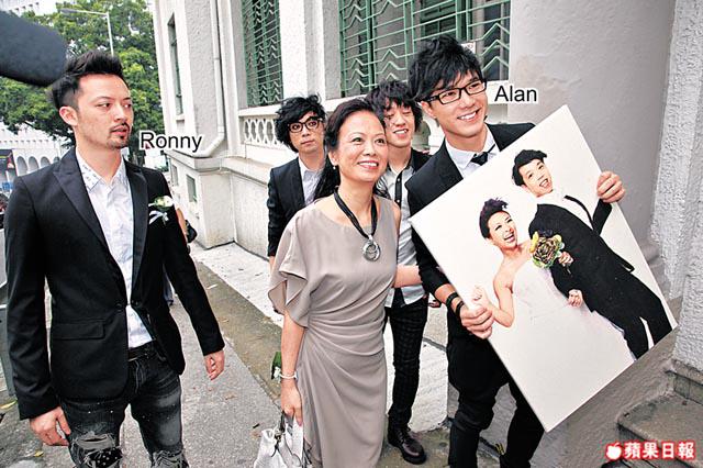 出名喜歡波點的商台DJ朱薰,昨日在「十全十美」(10年10月10日)的好日子跟拍拖8年的幕後音樂人譚健榮結婚,一對新人在下午先於半山的梅夫人婦女會進行註冊儀式,除了雙方家長及親友外,也有圈中好友及商台同事前來祝賀。由於新郎阿榮是樂隊Mr.成員Dash的弟弟,故一眾Mr.成員都有前來幫忙,其中Alan匆匆拿着新人照片到場。