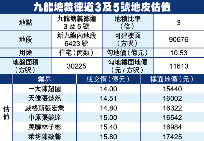 由於有義德道1號地皮的成交價作參考,嘉里當日以每呎樓面地價近1.66萬元,擊退華懋集團奪地之餘,同時刷新九龍住宅地的樓面呎價紀錄。業界一般估計,3及5號地皮每呎樓面成交地價會逾1.6萬元,加上兩地又可合併發展,故相信嘉里會盡辦法投得該地,以便在設計及佈局上,更具彈性,甚至可興建少量高增值洋房,增加將來售樓收入。