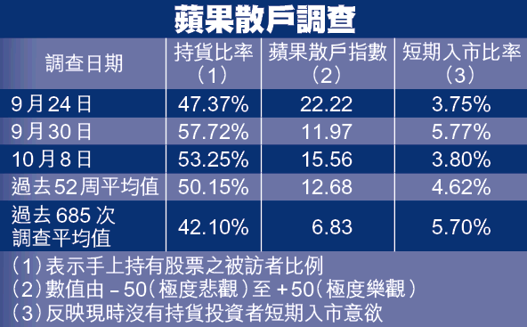 恒指9月迄今累漲2308點,投資者覺得位高勢危,多選擇先行套利。蘋果散戶調查顯示,看好後市的散戶指標上周為15.56,雖較前周11.97再升,但有意入市者比例卻由前周的5.77%,跌至3.8%;有貨在手的散戶比例亦由前周的57.72%,跌至53.25%。