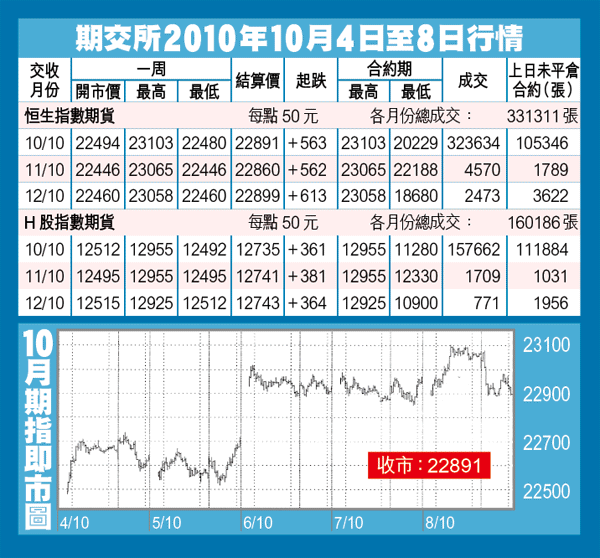 即月期指調整壓力顯現,上周五低開70點後,曾隨A股倒升134點,高見23103,惟仍受制於去年11月高位23110,以全日低位22891收市,跌78點,低水53點,成交合約7.3萬張。H期跌49點,收12735。
