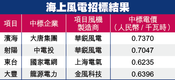 【本報訊】為日後拓展海上風電積累技術及管理經驗,國務院5月展開首輪100萬千瓦海上風電特許權項目招標,結果4個項目的中標企業全屬央企子公司,包括大唐集團、中電投集團、國家電網及國電集團,惟所有項目的最低報價均被否決。