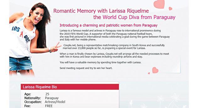 今屆南非世界盃舉行期間,在觀眾席「巨乳夾手機」爆紅的巴拉圭「奶機妹」莉爾莎列基美(LarissaRiquelme),人生目標原來是「嫁個南韓人」,夢想去南韓做過埠新娘,下月更會坐言起行到首爾相親。
