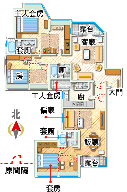 間隔:3房(2套)3廳;另工人套房及雙露台