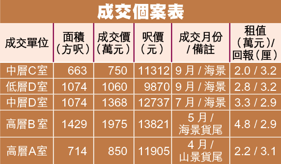 利嘉閣地產分行經理陳文諾表示,傲翔灣畔今年約有6宗二手成交,山景單位呎價9500至1萬元,海景戶每方呎9800餘至近1.4萬元。二手放盤約40個,叫價每方呎8900餘至1.4萬餘元。