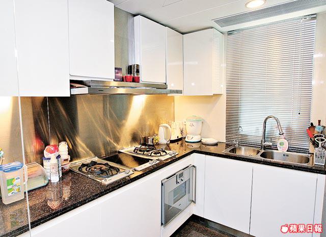 B室的廚房較大得以保留,唯一更改是用上玻璃間隔,通透之餘亦減低通往A室走廊的壓迫感。A室原裝廚房拆掉,連原裝飯廳空間改成偏廳,放有特大的躺椅,對面是電視機。