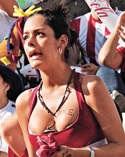 25歲球迷,今年南非世盃期間,憑在觀眾席以「巨乳夾手機」爆紅,贏得「奶機妹」稱號