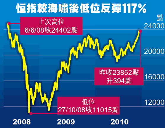 恒指昨日收23852點,再升394點或1.68%,再創金融海嘯後新高,較08年低位反彈逾倍;H股指數則升274點或2.06%,收13575點。即月期指收23874點,升293點,高水22點。