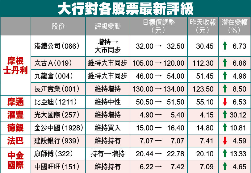 至於大摩分析員PraveenChoudhary則指,相信大部份有關港鐵的好消息已被反映,南昌站上蓋招標只會帶來代理收入,而近日增加南港島線資本開支為短期流動資金帶來壓力,故將評級由增持降至大市同步,但目標價由32元升至32.50元。