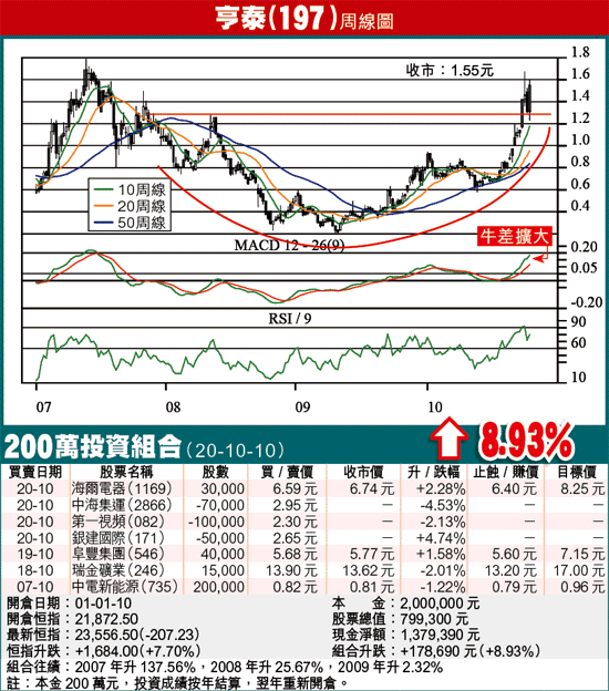 上月初推介亨泰時,預測其2010年度(6月年結)盈利為2.5億元,增長117%。集團在08年度曾賺2.55億元,上述預測,只是推算集團盈利能夠重返08年度水平而已,其實相當保守。